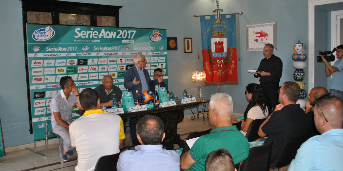 Per la prima volta nella storia il Beach Soccer targato FIGC-Lega Nazionale Dilettanti sbarca nella splendida località della Sicilia occidentale Castellammare del Golfo. Dopo tredici eventi organizzati a Catania e la felice esperienza del 2010 a San Leone (Ag) la Serie Aon 2017 apre ufficialmente la 14^ edizione del campionato italiano, riservato alle squadre del centro-sud, al B2875 - Beretta Beach Stadium situato all’interno del Villaggio Arena Playa Castellammare. Un’arena sontuosa, capace di ospitare più di 1.200 persone. Un mare cristallino e orizzonti mozzafiato sono il contesto ideale per vivere al meglio l’unico ed ufficiale Beach Soccer. Da venerdì 30 giugno a domenica 2 luglio si affrontano le nove squadre del girone B (centro sud). La presentazione della tappa si è tenuta presso il comune di Castellammare del Golfo, sono intervenuti il Sindaco Nicolò Coppola, il componente del Dipartimento beach soccer LND Ferdinando Arcopinto, il delegato LND di Trapani Salvatore Ernandez ed il promotore della tappa Massimo Messina.