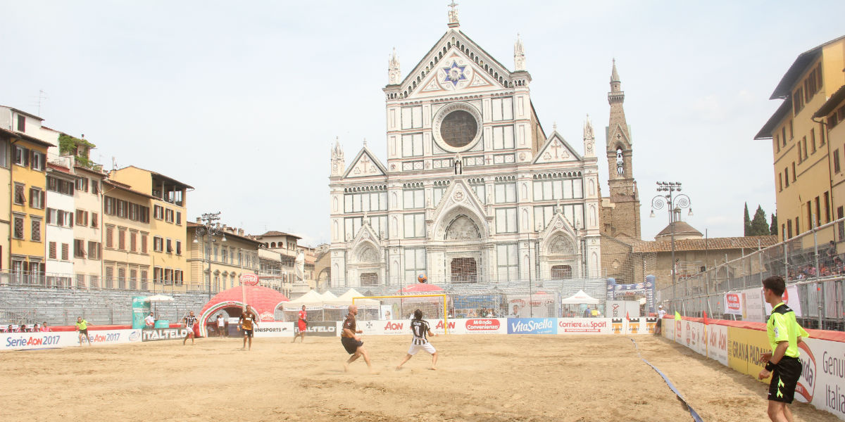 La tappa di Firenze, la prima del girone A del centro nord ci ha detto a chiare lettere che la Serie Aon si conferma ancora una volta come il campionato più bello del mondo, i migliori talenti del panorama internazionale sono qui, i beachers italiani continuano a sbocciare stagione dopo stagione, così ogni tappa è un film scandito da emozioni e colpi di scena. Tutto all’ombra di una delle chiese più belle d’Italia, a Piazza Santa Croce, culla del Rinascimento italiano. Una tappa iconica. Uno sport che funziona perché racchiude in sé gli aspetti più belli del calcio, lo spettacolo delle giocate tecniche con la fatica della corsa continua sulla sabbia. Trentasei minuti in cui c’è tutto, rovesciate, scambi veloci, acrobazie e agonismo, la ricerca del risultato e la voglia di divertirsi e divertire il pubblico che risponde sempre con entusiasmo. Anche in questa tappa di Firenze il “Beretta” il Beach Stadium si è riempito non solo di tifosi ma soprattutto di curiosi, turisti da tutto il mondo, donne e bambini accorsi sugli spalti con la sola voglia di assistere a uno spettacolo sportivo in completa serenità. Il Viareggio ha chiuso in testa alla classifica la tappa a punteggio pieno battendo in sequenza Livorno, Brescia e No Name Nettuno ma non è stato facile. Le assenze di Gori, Ramacciotti e Ozu si sono sentite. L’innesto di Leo è stato fondamentale, il nazionale lusitano ha segnato 10 reti diventando il bomber bianconero del campionato. In forma anche Valenti, Remedi e capitan Marinai. Bene il portiere Carpita che ha subito solo nell’ultimo match. L’Happy Car Sambenedettese ha chiuso la tappa con tre successi, uno ai rigori nel match di cartello con la Lazio e l’ultimo in scioltezza (9-2) con la Vastese. Protagonista della tappa, dopo aver già stupito in campionato, Lucas autore di due doppiette. Bene anche Perez, Palma, Addarii e Ietri, quest’ultimi due decisivi nell’ultimo incontro con la Vastese rispettivamente con due e tre gol. Il Pisa ha giocato solo due gare ed ha fatto il pieno di punti prendendosi la soddisfazione di battere il Livorno in un derby molto sentito. Protagonista il campione dei due mondi Madjer e gli azzurri Mirko Marrucci, Ortolini e Di Palma. Ai labronici non è bastata la verve di Salvadori e la “garra” degli spagnoli. Il Brescia ha preso il massimo da questa tappa, ha vinto quando doveva, con Nettuno e Romagna, ha perso rendendo la vita difficile a Viareggio. Protagonista la truppa rossocrociata della squadra lombarda: Meier, Wuest e Steinemann insieme hanno messo a segno 10 gol. La sorpresa della tappa è stata la matricola No Name Nettuno che ha colto la sua prima storica vittoria in Serie A con la Vastese ed ha dato filo da torcere ai campioni in carica del Viareggio. Ledhili e Trippa protagonisti, insieme hanno segnato sette reti.