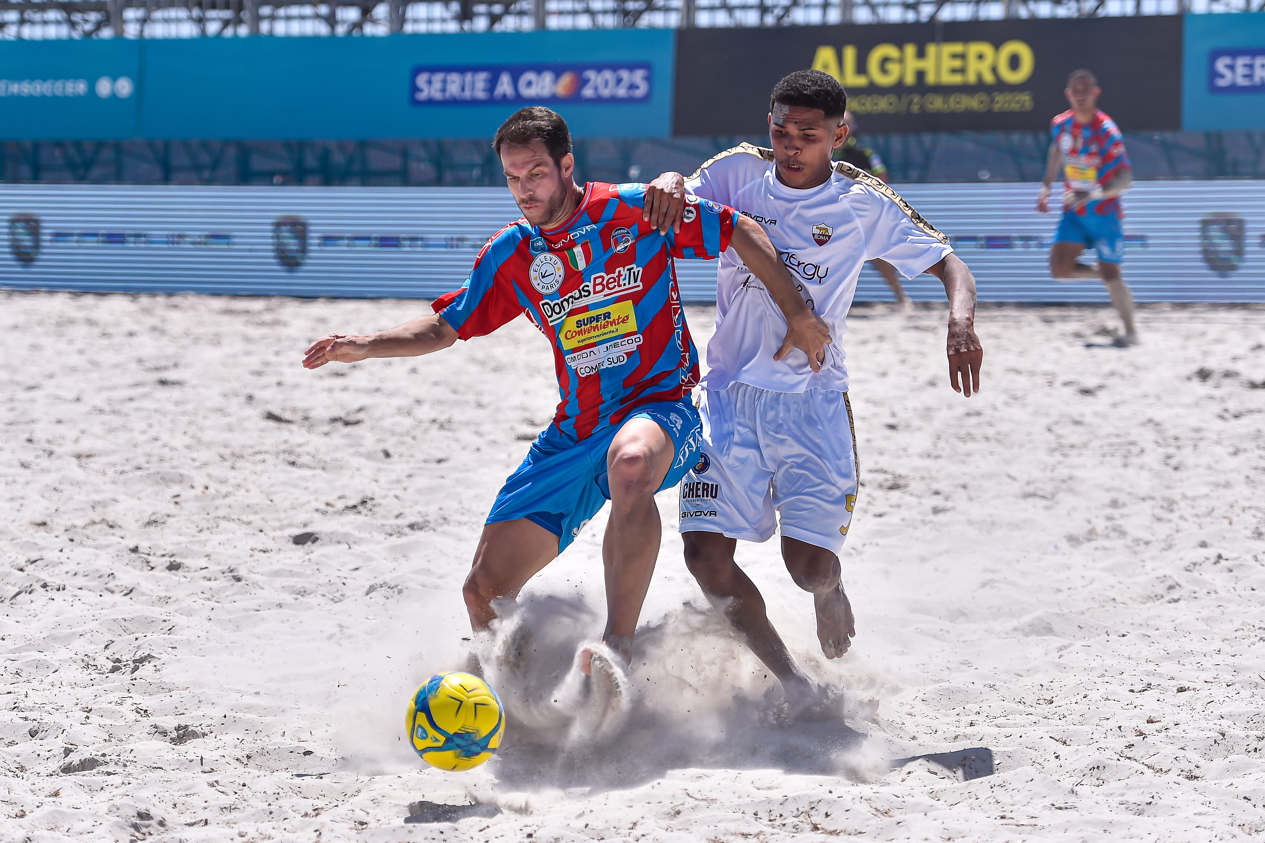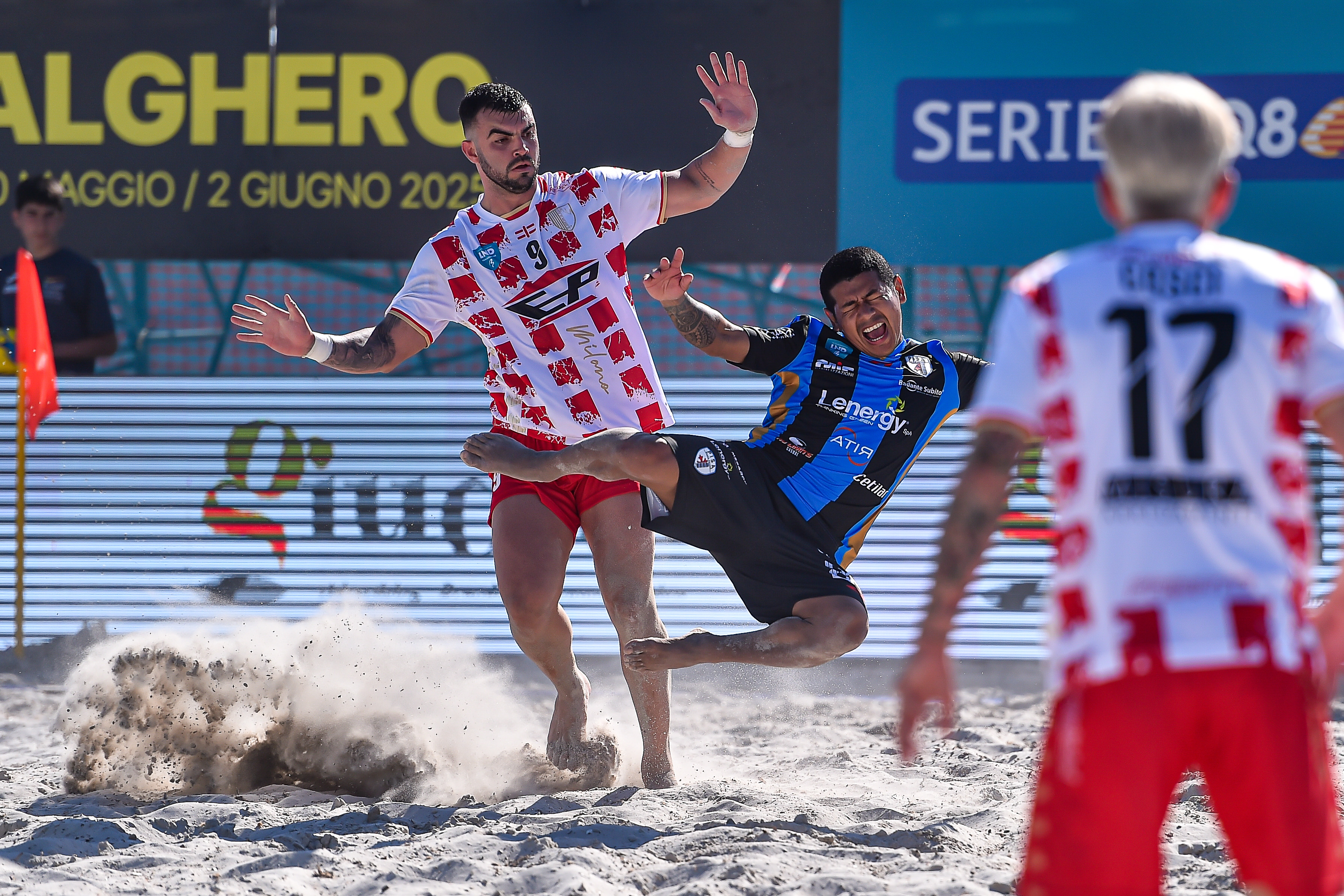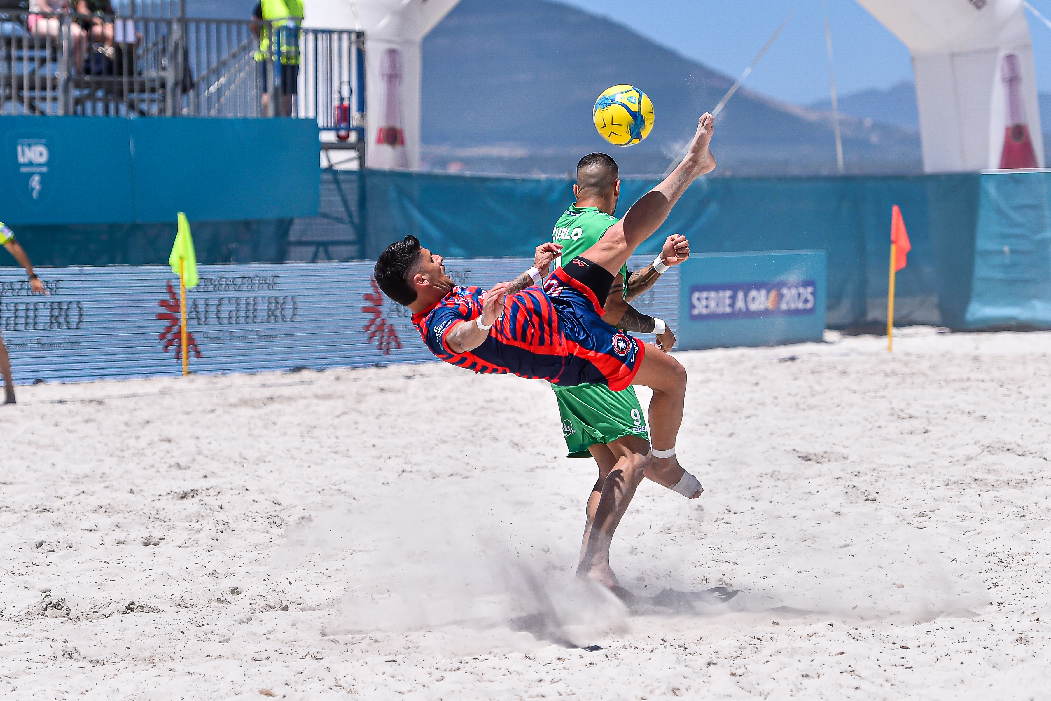 È cominciata nel segno delle emozioni la Serie A Q8 2025 di Beach Soccer. La prima tappa del massimo campionato targato FIGC – Lega Nazionale Dilettanti ha preso il via oggi sulla sabbia della Beach Arena di Alghero, lungomare San Giovanni, teatro già noto per le imprese azzurre e oggi cuore pulsante della Poule Scudetto. Cinque le gare disputate in questa prima giornata, aperta dalla sfida tra Happy Car Sambenedettese e We Beach Catania e chiusa dallo show del Cagliari BS contro il Bologna (nella foto Hodel).