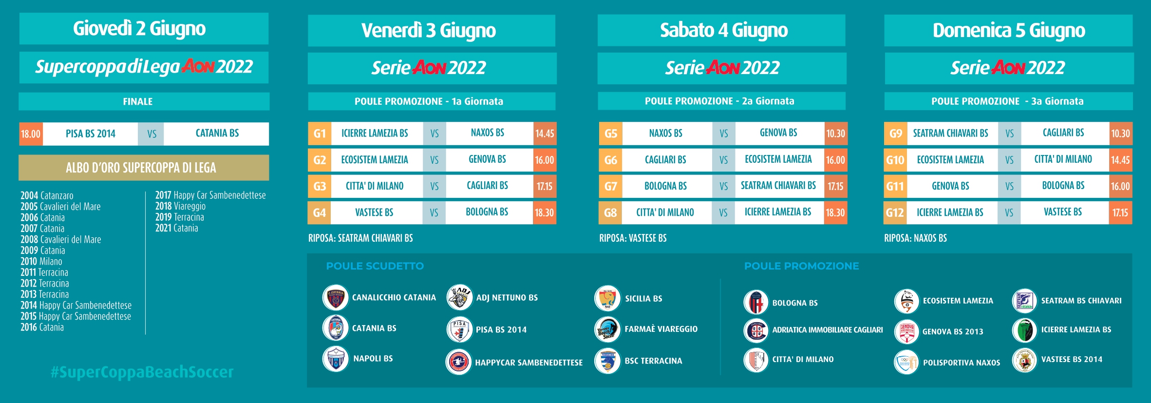 Parte dalla suggestiva spiaggia davanti alla Nave di Cascella, nel centro nevralgico di Pescara, la 18^ edizione del Campionato Beach Soccer FIGC-Lega Nazionale Dilettanti. Un avvio in grande stile con la Supercoppa in programma giovedì 2 giugno alle 18.00 davanti alle telecamere di SkySport che riprenderanno in diretta l’evento (SkySport Calcio, canale 202).  Il Pisa trionfatore della Serie A 2021 e il Catania detentore della Coppa Italia dello scorso anno si contenderanno il primo trofeo della stagione. Per la prima volta nelle diciotto edizioni della Serie A la Supercoppa si gioca a Pescara che è tornata ad ospitare una tappa del beach soccer FIGC-Lega Nazionale Dilettanti dopo dodici anni (2010).