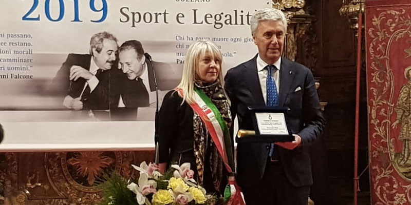 Consegnati oggi i riconoscimenti per la sesta edizione del Premio Mitos “sport e legalità”, organizzato dal comune di Gozzano, in provincia di Novara. La giuria, presieduta dal Campione del Mondo 1982 Marco Tardelli, ha assegnato il premio al Presidente della LND Cosimo Sibilia (nella foto con il sindaco di Gozzano, Carla Biscuola). In rappresentanza del mondo del calcio, sempre per l’edizione 2019, hanno ricevuto lo stesso riconoscimento anche Francesco Ghirelli, presidente della Lega Pro, Marcello Nicchi, presidente AIA, e Luigi Barbiero, coordinatore del Dipartimento Interregionale della LND. Premiata anche Daniela Stradiotto, presidente dell'Osservatorio per le Manifestazioni Sportive.