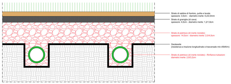 - Strato di pietrisco (di inerte riciclato) – spessore: 14,0cm – diametro inerte: 2,0/4,0cm