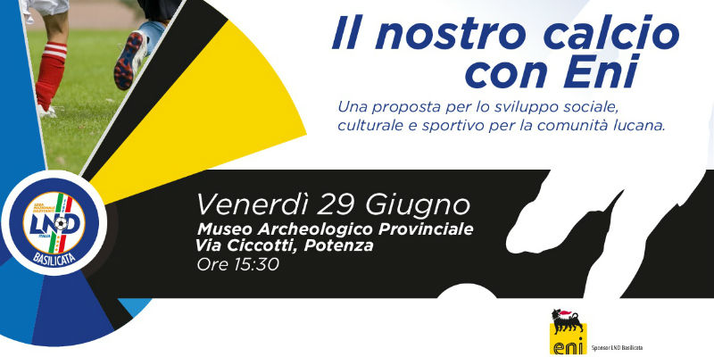 Si terrà il prossimo venerdì 29 Giugno, presso il museo archeologico provinciale di via Ciccotti a Potenza, la presentazione del progetto “Il nostro calcio con Eni” redatto dal Comitato Regionale Basilicata con lo sponsor Eni. All’evento, in programma alle ore 15,30, interverranno il Presidente del Comitato Regionale Basilicata Piero Rinaldi, il Presidente della Lega Nazionale Dilettanti Cosimo Sibilia, il Coordinatore Federale del Settore Giovanile e Scolastico del C.R. Basilicata Carlo Ottavio e il Responsabile coordinamento progetti Eni in Val d’Agri Walter Rizzi.